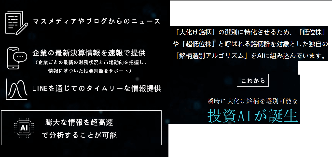 投資顧問や証券マン、ロボアドバイザーが苦手とする、大化けする銘柄の選別を、我々のAI「Stock Sieve」が可能にしました。